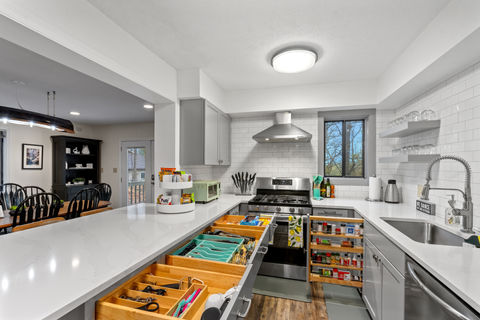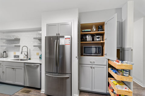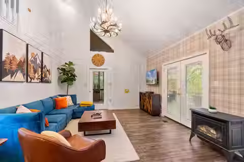 The lodge-inspired living room offers a warm, rustic retreat perfect for family gatherings. The modern chef’s kitchen is fully equipped with essential appliances and two coffee stations upstairs and downstairs. Dine in the lake-themed dining room beneath a custom canoe light fixture for a one-of-a-kind experience. Each bedroom is thoughtfully designed with unique themes, combining comfort and style for the perfect mountain escape.